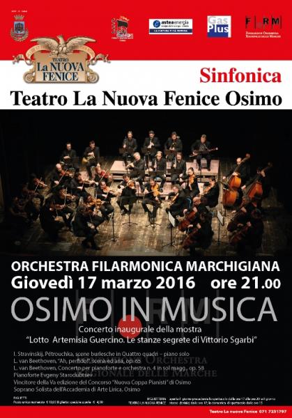 In occasione della mostra "Lotto, Artemisia, Guercino. Le stanze segrete di Vittorio Sgarbi", in esposizione dal 18 Marzo al 30 Ottobre 2016 a Palazzo Campana di Osimo, Giovedì 17 Marzo la Filarmonica Marchigiana terrà al Teatro la Nuove Fenice un CONCERTO INAUGURALE, con la partecipazione di Evgeny Starodubtsev, vincitore della V° edizione del concorso "Nuova Coppa Pianisti" di Osimo e dei solisti dell'Accademia di Arte Lirica.