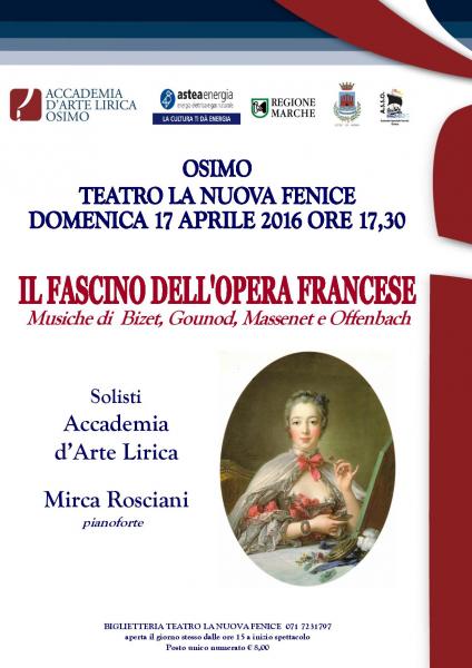 Un appassionante incontro con i grandi compositori della musica lirica francese attende il pubblico osimano domenica 17 aprile alle ore 17.30 presso il Teatro La Nuova Fenice di Osimo. “Il fascino dell’opera francese” è il titolo del concerto con le bellissime voci dei solisti dell’Accademia d’Arte Lirica, che interpreteranno musiche di Bizet, Gounod e Massenet. Gli spettatori saranno rapiti dalla tormentata e struggente storia d’amore, ambientata nella Francia del 1721, tra i giovani Manon e Des Grieux messa in musica da Massenet, dalle angosce giovanili del Werther di goethiana memoria. Non mancherà Bizet con la sua seducente Carmen e Gounod con l’infernale sarcasmo di Méphistophélès nel Faust. Un’occasione imperdibile per scoprire lo charme della musica francese col talento dei solisti dell’Accademia osimana, accompagnati al pianoforte da Mirca Rosciani.