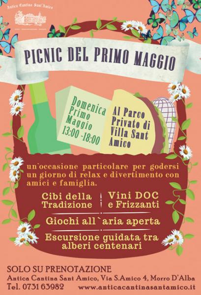L`Antica Cantina Sant`Amico organizza il consueto appuntamento di Relax e Tradizione con il Pic Nic del Primo Maggio sui prati dell`Orangerie di Villa Sant`Amico. L`evento, a cui si puo` partecipare previa prenotazione, prevede un intera giornata, dalle 13.00 alle 18.00 presso il parco privato di Villa Sant`Amico. All`arrivo degli ospiti verra` fornito il cestino da godersi sul prato della Orangerie oppure all`ombra di alberi secolari. Il cestino include tutto l`occorrente per il pic nic tra cui panino con porchetta, pecorino, fave e altre tipicita`. Inoltre viene fornito anche il vino di nostra produzione, acqua e il classico bicchierino finale di Grappa Bijoux di Lacrima o Visciola Sant`Amico. Alle 17.00 circa partira` un escursione guidata facoltativa per esplorare i 12 ettari di parco, percorrendo un antico sentiero riscoperto tra alberi secolari. L`evento si svolgera` al coperto in caso di maltempo. INFO E PRENOTAZIONI (in anteprima per i clienti della Cantina) 073163982 - 3683556820
