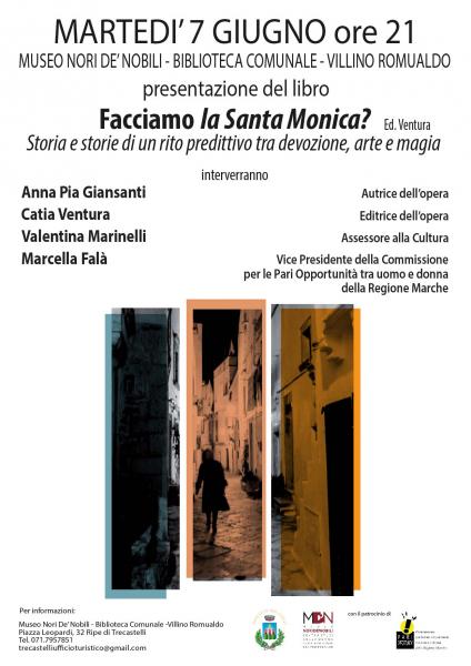 Il Museo Nori De’ Nobili e la Biblioteca Comunale di Trecastelli presentano, martedì 07 giugno alle ore 21.00, il libro di Anna Pia Giansanti Facciamo la Santa Monica? – Storia e storie di un rito predittivo tra devozione, arte e magia- edizioni Ventura. Interverranno l’autrice dell’opera, Anna Pia Giansanti, Catia Ventura, editrice del volume, Valentina Marinelli, Assessore alla Cultura di Trecastelli e Marcella Falà, Vice Presidente della Commissione per le Pari Opportunità tra uomo e donna della Regione Marche. Il libro è un ponte tra il Sud e le Marche, tra la Magna Grecia e il Montefeltro, con un timido affaccio sulla verde e boscosa Umbria e uno sguardo all’Abruzzo ferito, definito “terra di nessuno”. “Santa Monica Pietosa, santa Monica Lacrimosa, a Roma andasti e da Milano venisti, e come portasti notizie di tuo figlio così portami notizie di…”. Inizia così la narrazione che Anna Pia Giansanti fa in questo suo ultimo volume, che nasce da un intreccio tra magia, devozione e arte.Anna Pia Giansanti, storico dell’arte, si occupa da sempre di didattica dei beni culturali e archeologia nell’insegnamento di discipline storiche, letterarie e di comunicazione nelle arti. Ha tenuto diverse conferenze presso numerose associazioni culturali nelle Marche, Romagna e Abruzzo. Ha pubblicato saggi e articoli in materia di Arte e Archeologia e i libri "La Maddalena di Senigallia, cronaca di un viaggio da leggenda e realtà" e “Angelica Catalani, la cantatrice dei re”. La manifestazione è promossa dal Comune di Trecastelli, dal Museo Nori De’ Nobili e dalla Biblioteca Comunale ed ha il patrocinio della Commissione per le Pari Opportunità tra uomo e donna della Regione Marche. La partecipazione all’evento è a ingresso libero.