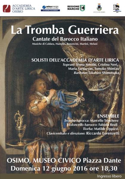 Domenica 12 giugno alle ore 18.30, nella cornice del Museo Civico di Osimo, verrà eseguito il concerto barocco “La Tromba guerriera”, con gli allievi dell’Accademia accompagnati al clavicembalo da Riccardo Lorenzetti ed un ensemble di strumenti antichi. Verranno eseguite musiche di Bononcini, Caldara, Haendel, Martini e Melani. Ingresso gratuito.