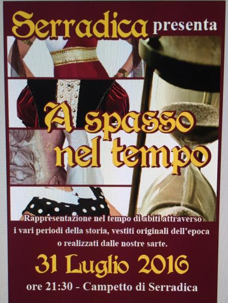 Siamo alla III° Edizione di questo evento estivo che coinvolge un intero paese, appunto il paese di Serradica, nel comune di Fabriano, si tratta di una rappresentazione di abiti a tema e quest' anno sarà "A SPASSO NEL TEMPO" il nostro obiettivo è dimostrarvi al meglio i vari periodi della storia, gli abiti sono stati cuciti dalle nostre sartine oppure sono originali. A fine manifestazione ci sarà la premiazione.