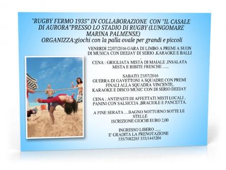 SE SEI VICINO AL MONDO DEL RUGBY O VUOI CONOSCERLO ,LA "RUGBY FERMO 1935 "IN COLLABORAZIONE CON" IL CASALE DI AURORA" PRESSO LO STADIO DI RUGBY (LUNGOMARE MARINA PALMENSE) ,USCITA AUTOSTRADALE DI PORTO SAN GIORGIO.