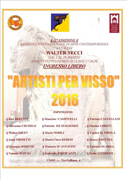 "ARTISTI PER VISSO 2016" Si ripete per l'11° anno l'appuntamento con la rassegna di arte contemporanea "ARTISTI PER VISSO", a cura di Walter Necci, affermato artista romano con radici nel territorio marchigiano. La mostra si svolgerà nei locali di Via Galliano, 4, proprio nel centro storico vissano, e vede la partecipazione di artisti nazionali e internazionali. Eterogenea e soprattutto di qualità, la mostra sarà un piacevole momento da dedicare all'arte in vacanza. Espongono: Rita Bertani, Maurizio Campitelli, Patrizia Castellani, Giovanna Crudele, Patrizio de Magistris , Marina Loreti, Walter Necci, Maria Nobili, Yajaira M. Pirela, Anna Proietti, Maria Clara Rebeiz, Marco Recchia, Giuseppe Ribechi, Manuela Scannavini, Fabrizia Sgarra, Natsuki Suzuki, Gabriella Tirincanti e Paolo Viterbini. Dal 1 al 28 agosto, aperto tutti i giorni dalle 10 alle 12,30 e dalle 17 alle 20,30, aperture straordinarie in concomitanza con eventi. VI ASPETTIAMO!!!!