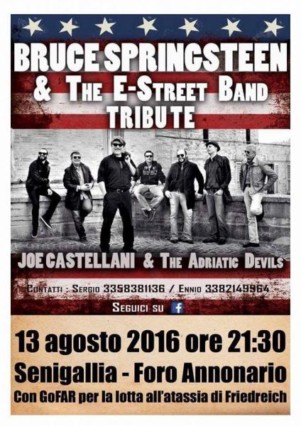 I Diavoli contro l’Atassia: a Senigallia, il 13 agosto alle 21:30 “Joe Castellani & the Adriatic Devils; dopo il successo dell’anno scorso, sempre al Foro Annonario, tornano in concerto per la stessa causa. Capita che un semplice impiegato si tolga gli occhiali, la giacca e diventi Superman... Joe Castellani & the Adriatic Devils si trasfomano nel Boss e nella sua E. Street Band. Questo gruppo cover sta raccogliendo successi lungo tutta la costa adriatica e anche più in là. il 13 agosto suoneranno gratuitamente a Senigallia presso il foro annonario promuovendo la raccolta di fondi a favore di GoFAR per la lotta all'Atassia di Friedreich. Per l'occasione agli spettatori sarà possibile effettuare una donazione presso il gazebo collocato sul luogo del concerto. Mi raccomando, venite numerosi, per sconfiggere l’Atassia di Friedrich a suon di ROCK! La causa per cui è stato organizzato l’evento è importante: l’Atassia di Friedreich è una malattia rara, le statistiche riportano circa 100000 casi al Mondo di cui 1200 in Italia, che priva chi ne è affetto di alcune facoltà neuromotorie, provocando gravi disfunzioni motorie, problemi cardiaci, alterazioni del senso del tatto e diverse patologie collaterali. Per questa malattia non esiste ancora una cura, per quanto ne siano stati individuati i meccanismi ed i processi responsabili. GoFAR si occupa del supporto alla sperimentazione di farmaci che stanno dando risultati promettenti, tuttavia questo processo è ancora lungo e costoso ma porta una grande speranza fra i malati di Atassia di Friedreich.