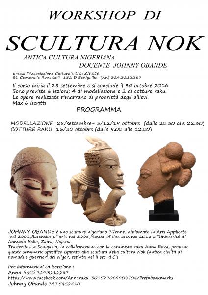 Il seminario di scultura ceramica Nok è per chiunque voglia cimentarsi nella modellazione tridimensionale, le forme suggerite nel volantino , dimostrano la semplicità e la stilizzazione delle figure arcaiche. Si adotta la tecnica raku che ci permette , oltre alla veloce asciugatura e cottura, una particolare smaltatura dagli effetti spettacolari .Per ulteriori chiarimenti rivolgersi ai numeri pubblicati nella locandina