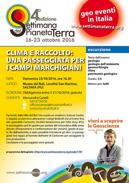 Partendo dalla Villa del Balì , si seguirà un percorso guidato da un geologo atttraverso i campi limitrofi che arrivano fino alla splendida Cartoceto, località famosissima per l'olio d.o.p.