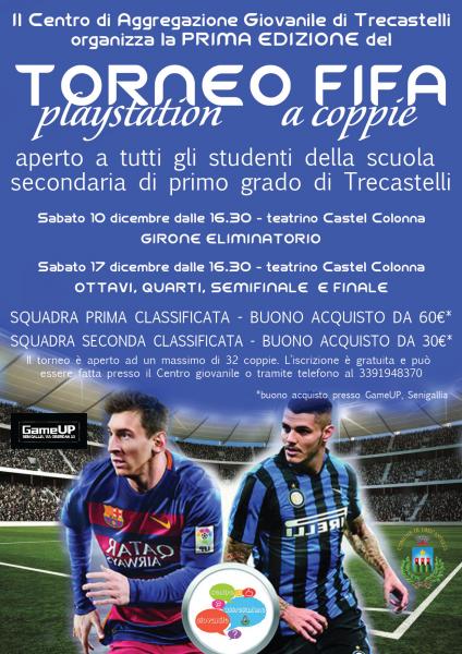 Il Centro di Aggregazione Giovanile di Trecastelli organizza la PRIMA EDIZIONE del TORNEO FIFA PLAYSTATION A COPPIE.L’iniziativa è aperta a tutti gli studenti della scuola secondaria di primo grado di Trecastelli. Si partirà con il primo appuntamento sabato 10 dicembre, dalle ore 16.30, presso il Teatrino di Castel Colonna. La giornata di gioco terminerà con il girone eliminatorio, per riprendere poi sabato 17 dicembre, sempre dalle ore 16.30 al Teatrino di Castel Colonna, in cui le squadre partecipanti avranno modo di sfidarsi e dare il meglio di sé tra gli ottavi, quarti, semifinale e finale. Il torneo vuole essere un momento di gioco, svago e aggregazione per tutti i ragazzi del territorio. Le partite saranno un’occasione per i giovani che vi prenderanno parte sia di divertimento ma anche di sano confronto con i compagni e la sportività. I vincitori, prima e seconda squadra classificata, si aggiudicheranno come premio dei buoni, da utilizzare per l’acquisto di giochi o gadget per playstation. Il torneo è aperto ad un massimo di 32 coppie. La manifestazione è promossa dal Comune di Trecastelli in collaborazione con il Centro di Aggregazione Giovanile. L’iscrizione è gratuita e può essere effettuata presso il Centro di Aggregazione Giovanile oppure telefonando al numero 339.1948370