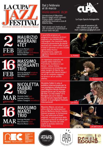 Dato il successo della prima edizione, siamo lieti di presentare la 2° Edizione de "La Cupa Jazz Festival", che anche quest'anno affida la direzione artistica a Massimo Manzi. Come sempre, nel tipico stile de La Cupa Spazio Autogestito, aperitivo, cena e bar aperto dalle 19:30!! Il food sarà curato dalla "Cucina Ribelle della Cupa Sp.A.", che penserà per voi dei piatti con prodotti rigorosamente BIO. Ogni serata sarà dedicata ad uno strumento in particolare e al suo ruolo nel jazz ; con un'introduzione di Massimo Manzi e degli artisti coinvolti. Prima e dopo i concerti, sottofondo musicale a cura di Alberto Alba. Un ringraziamento speciale agli amici della Aps Fonte della Serpe per il sostegno nell'organizzazione!!! INIZIO LIVE RIGOROSAMENTE ORE 21:30 Qui di seguito il PROGRAMMA completo: GIOVEDI' 2 FEBBRAIO: Tema: IL PIANOFORTE ore 19:30: inizio serata ore 21:30: Maurizio Marrani 4tet (Umbria) Maurizio Marrani - Pianoforte Graziano Brufani - Contrabbasso Angelo Lazzeri - Chitarra Nicola Polidori - Batteria http://www.mauriziomarrani.info/quartet.html GIOVEDI' 16 FEBBRAIO: Tema: IL TROMBONE ore 19:30: inizio serata ore 21:30: Massimo Morganti TRIO (Marche) Massimo Morganti - Trombone Barend Middelhoff - Sax (Ospite straniero - Olanda) Nico Menci - Pianoforte http://www.massimorganti.com/ GIOVEDI' 2 MARZO: Tema: LA VOCE ore 19:30: inizio serata ore 21:30: Nicoletta Fabbri TRIO (Emilia Romagna) Nicoletta Fabbri - Voce Gabriele Zanchini - Pianoforte Stefano Travaglini - Contrabbasso http://www.nicolettafabbri.it/ GIOVEDI' 16 MARZO: Tema: LA BATTERIA ore 19:30: inizio serata ore 21:30: Massimo Manzi TRIO (Marche) Massimo Manzi - Batteria Max Giovannini - Basso Domingo Muzietti - Chitarra https://www.facebook.com/manzidrum56/ Per info e contatti: Simone Sabini 333/3656562 e mail: simone.sabini@gmail.com ( Cinzia Sabbatini - Comunicazione eventi )