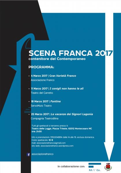 L'Associazione Franco presenta la terza edizione di Scena Franca – Contenitore del Contemporaneo in programma dal 4 al 25 marzo 2017 al Teatro delle Logge di Montecosaro (MC).