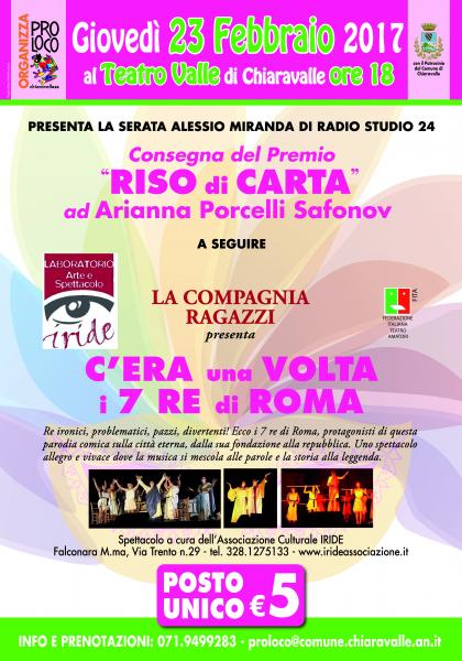 La premiazione, preceduta da alcuni brani comici dell'autrice stessa, avverrà giovedì 23 febbraio alle ore 18 presso il Teatro Valle di Chiaravalle (AN) e sarà seguita da uno spettacolo teatrale comico messo in scena dalla Compagnia Ragazzi dell'Associazione Culturale "Iride" di Falconara dal titolo "C'era una volta ... i sette Re di Roma".