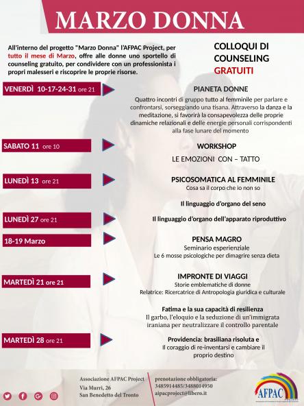 Un mese interamente dedicato al Femminile. Incontri, Seminari, Meditazione, Conversazioni, Corsi Esperenziali, uno sportello d’ascolto dedicato. Il tutto per approfondire la dimensione del Femminile dal punto di vista culturale, del benessere, della reciproca conoscenza. Si accede solo previa prenotazione. Info ed iscrizioni AFPAC PROJECT 3485914485, 3488014950, aipacproject@libero.it, https://www.facebook.com/events/1430973536937149/