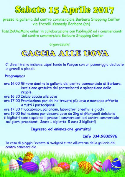 Un pomeriggio aspettando Pasqua dedicato a grandi e piccoli con caccia alle uova, giochi, truccabimbi, palloncini, merenda...tutto gratis!Alle 19 estrazione del biglietto per vincere un uovo Giampaoli dolciari da 2kg! Vi aspettiamo numerosi. Info 334.9832976 o www.publing82.it
