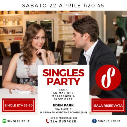 Single Life è lieto di annunciare la prima cena completa in provincia di Ancona. Sabato 22 aprile saremo all'Eden Park, il bellissimo resort di Marina di Montemarciano dove ci è stata riservata un'intera sala tutta per noi. Una ricchissima cena sarà il preludio ad una divertente ed intrigante serata nella quale la parola d'obbligo sarà fare nuovi incontri in un contesto di totale relax. Durante il pasto sarà possibile messaggiarsi con i partecipanti seduti agli altri tavoli mentre a fine cena sarà possibile partecipare allo Slow Date, una formula molto più rilassata ed efficace rispetto al classico Speed Date. Sarà impossibile tornare a casa senza aver fatto qualche nuova conoscenza. Ingresso, menu completo e coordinamento Single Life: € 25,00 Chiamate subito per prenotarvi, posti limitati. Tel. 324.0894628