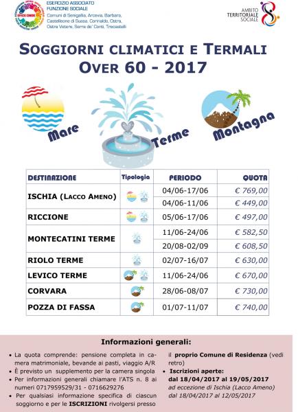 Si pubblica il volantino relativo alle località scelte per l'organizzazione dei soggiorni estivi climatici e termali Over 60 per l'anno 2017 che il Responsabile Area Anziani dell'Ufficio Comune ha predisposto per la popolazione dell'Ambito Territoriale Sociale n. 8.Le iscrizioni si apriranno il 18/04/2017 e fino al 19/05/2017.Informazioni e Iscrizioni presso l'Ufficio Segreteria e/o Assistente Sociale del Comune di Castelleone di Suasa.