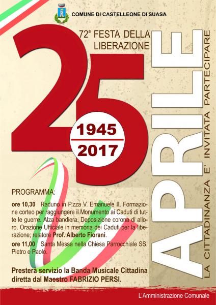 L'Amministrazione Comunale di Castelleone di Suasa, in collaborazione con le locali Sezione dell' A.N.C.R. (Associazione Nazionale Combattenti e Reduci), l'A.N.P.I. (Associazione Nazionale Partigiani d’Italia) e con la partecipazione dell’A.N.M.I.L. (Associazione Nazionale Mutilati e Invalidi sul Lavoro), intende ricordare MARTEDI' 25 APRILE, il 72° ANNIVERSARIO DELLA LIBERAZIONE (25 APRILE 1945) con il seguente programma: