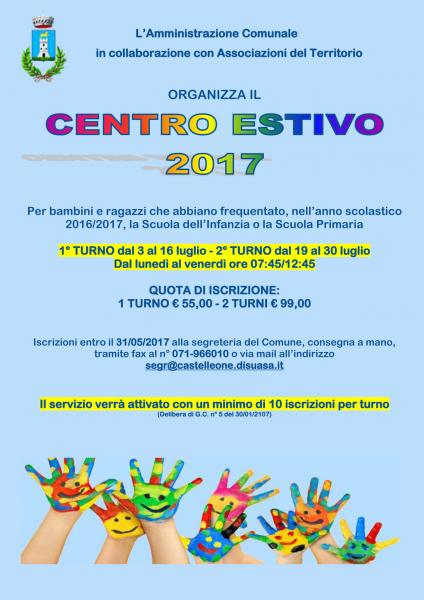 L'Amministrazione Comunale, in collaborazione con Associazioni del Territorio, anche per il corrente anno, organizza per i bambini e ragazzi che abbiano frequentato la Scuola dell'Infanzia o la Scuola Primaria, due turni di Centro Estivo 2017:1° Turno dal 3 al 16 Luglio e2° Turno dal 19 al 30 Luglio, dal lunedì al venerdì, ore 7,45/12,45.Le quote d'iscrizione sono state fissate in € 55,00 per 1 turno, mentre in € 99,00 per 2 turni.Le iscrizioni dovranno essere consegnate alla segreteria del Comune a mano, tramite fax n. 071-966010 o per via telematica, all'indirizzo segr@castelleone.disuasa.it, entro il 31 Maggio p.v.