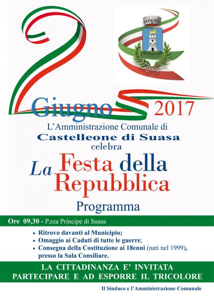 L'Amministrazione di Castelleone di Suasa, per l’occasione, ha voluto celebrare questa giornata "speciale", ritrovandoci tutti, alle ore 9,30, davanti al Municipio per portare un omaggio ai Caduti di tutte le guerre e a seguire, sarà consegnato il testo della Costituzione Italiana, riprodotto su chiavetta USB, a tutti i giovani che compiono il 18° anno di età (nati nel 1989).