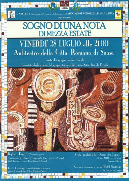 VENERDI 28 Luglio ore 21,00Anfiteatro Romano di SuasaSerata musicale con gruppi laurentini, (in cui collaborano anche giovani castelleonesi)!