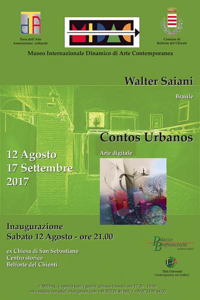 La stagione artistica 2017 del Museo MIDAC a Belforte del Chienti, continua con il quarto evento dell'anno: "Contos Urbanos" personale di Walter Saiani (Brasile). La mostra, curata da Terra dell'Arte e con il patrocinio dell'Amministrazione Comunale, si svolgerà nell'ex Chiesa di San Sebastiano, centro storico di Belforte del Chienti, dal 12 Agosto al 17 Settembre 2017. Walter Saiani, nato a San Paolo, Brasile nel 1947. La sua prima partecipazione artistica fu a dieci anni quando ricevette il primo premio ad un concorso di arte infantile. Avendo studiato come designer industriale ha lavorato per alcuni anni nell'industria aeronautica ed automobilistica. Negli anni 80 ha lavorato nel campo della grafica artistica e nella scenografia con due distaccati artisti brasiliani come Elifas Andreato e Tide Hellmeister facendo il suo ingresso definitivo nel mondo dell'arte. Ha esposto in Brasile, Francia, Italia, Messico, Cuba e Paesi Bassi. I suoi lavori fanno parte di collezioni pubbliche e private di tutto il mondo. "[..] Lettere che insieme ad altre lettere si fanno parola. Una parola in apparenza priva di senso compiuto, ma che accompagna, come una dolcissima canzone, il viaggio senza sosta dei viaggiatori del mondo. È il viaggio di chi sa che la meta sarà raggiunta solo con l'ultimo passo. Questa serie di Walter Saiani è un invito a non fermarsi. È un invito a continuare a sognare.” (Alfonso Caputo)