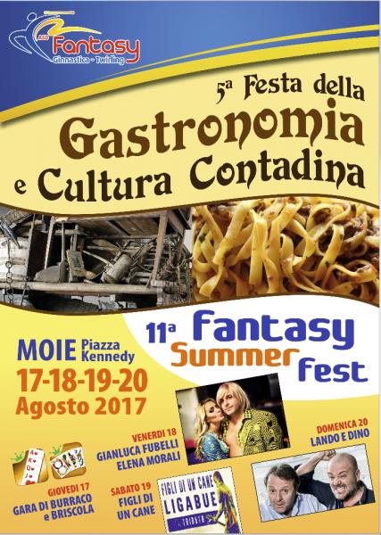 Presenta la serata Lara Gentilucci. Lo spettacolo continua Sabato 19 Agosto dalle ore 21 sempre nella magica cornice di Piazza Kennedy con il concerto live che vedrà impegnata la Cover Band Figli di un Cane Tributo a Ligabue. Domenica 20 Agosto sarà il duo comico Lando e Dino a salire sul palco in Piazza Kennedy di Moie. I comici marchigiani coinvolgeranno il pubblico in un susseguirsi di esilaranti gag e battute. Spazio al divertimento e garanzia di tante risate. Tutti i giorni dalle ore 19 entreranno in funzione gli Stands Enogastronomici.