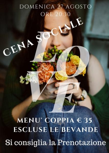 Domenica 27 Agosto ore 20:30 - l'Associazione "Mangia Bene" organizza la Cena Sociale "LOVE" Menù in fase di scelta. Menù Coppia € 35 (Escluse le Bevande) SI CONSIGLIA LA PRENOTAZIONE