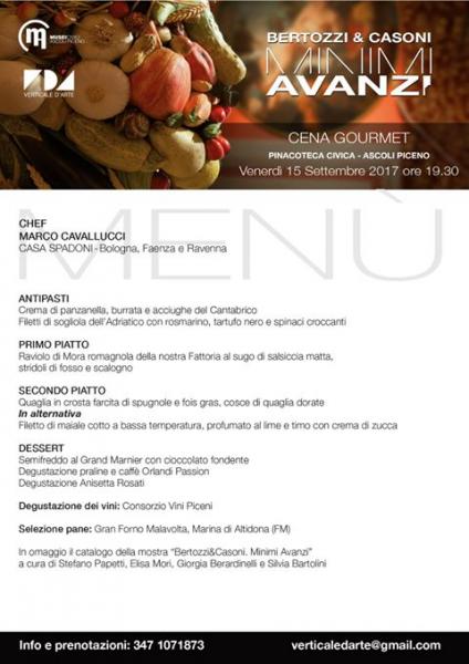 La cena gourmet di finissage della mostra, dunque, prevede un menù interamente creato dallo Chef Cavallucci con alcuni dei suoi celebri piatti al fine di soddisfare le esigenze di un pubblico sempre più variegato e attento nell’approccio alla tavola, e segna, per la prima volta nelle Marche, la collaborazione dell’Associazione culturale Verticale d’Arte con Casa Spadoni, mentre conferma la partecipazione del Consorzio Vini Piceni e dell’Istituto professionale statale servizi per l’enogastronomia e l’ospitalità alberghiera di Ascoli Piceno, entrambi partners del progetto sin dalla sua ideazione, nonché il sostegno di Anisetta Rosati, Gran Forno Malavolta, Orlandi Passion e Sabelli.