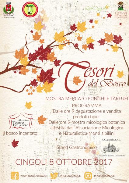 Anche quest’anno la cittadinanza è invitata a partecipare all’appuntamento di forte richiamo turistico, “I Tesori del Bosco”, la mostra mercato di funghi e tartufi con l’intento di avvicinare il pubblico ai sapori e ai saperi genuini, organizzata dall’ATC Pro Loco con la collaborazione del Comune di Cingoli.