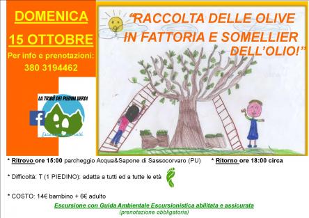 La quota comprende: passeggiata tra gli olivi sulle dolci colline del Montefeltro, attività di educazione ambientale (cenni sulla botanica dell'olivo e sulla sua coltivazione nelle Marche e di tutto il processo di trasformazione dall'albero alla bottiglia), raccolta delle olive, attività di assaggio e valutazione dell'olio e delle sue proprietà con guida abilitata GAE e Agronomo dell'azienda agricola + bruschettata con pane, aglio e olio extra vergine di oliva delle olive dell'Azienda e del territorio montefeltrino