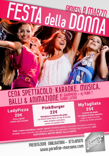 Festa della Donnacena spettacolo con karaoke, musica & balli: animazione by Giampiero & Sabor Latinogiovedì 8 marzo 2018PRENOTAZIONE OBBLIGATORIA: 0731.605070