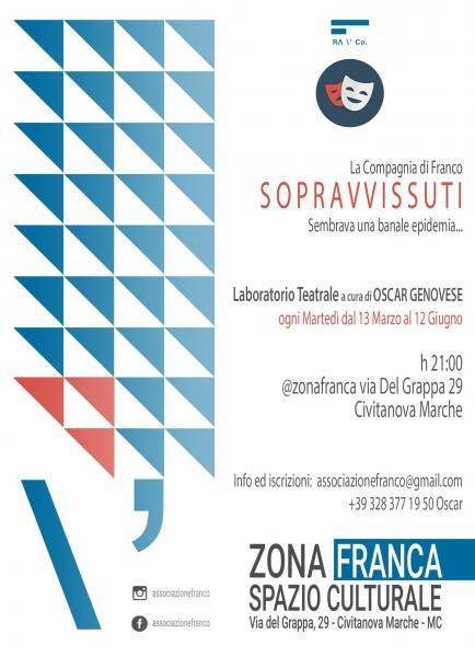 Martedì 13 marzo parte il laboratorio teatrale "SOPRAVVISSUTI" condotto da me nello spazio Zona Franca a Civitanova Marche, via del Grappa 29. Dal 13 marzo, ogni martedì fino al 12 giugno.