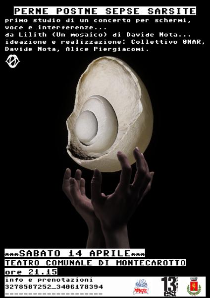 Sabato 14 aprile epilogo della stagione teatrale di Montecarotto a cura dell’associazione culturale 13 Gradi Est. Sul palco i giovanissimi, eclettici e talentuosi artisti del Collettivo ØNAR in “PERNE POSTNE SEPSE SARSITE - primo studio”, concerto per schermi, voci e interferenze, trasposizione del romanzo “Lilith (Un mosaico)”di Davide Nota.