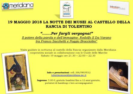 In occasione della notte dei musei istituita dal MIBACT, sabato 19 maggio 2018 Meridiana cooperativa sociale e Guide delle Marche organizzano visite guidate in notturna al castello della Rancia di Tolentino sul tema:
