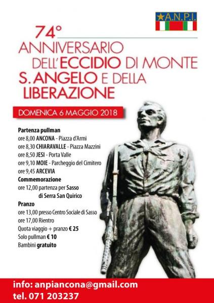 Il Comitato Provinciale dell’ANPI di Ancona vi invita a partecipare al 74° Anniversario dell’Eccidio del Monte Sant’Angelo di Arcevia che si svolgerà DOMENICA 6 MAGGIO 2018. Per l’occasione abbiamo organizzato un bus che partirà da Ancona (ore 8.00 piazza D’Armi) e che farà tappa poi a Chiaravalle ore 8.30 (Piazza Mazzini), a Jesi ore 8.45 (Porta Valle), a Moie ore 9.00 (Parcheggio del Cimitero). Dopo la Commemorazione ci si sposterà presso il Centro Sociale di Sasso di Serra San Quirico dove si svolgerà il pranzo dei soci e dei simpatizzanti della nostra Associazione. Il costo del viaggio in bus e del pranzo è di 25 € ma per chi vuole è possibile effettuare solo il viaggio, oppure venire autonomamente al pranzo. Per i bambini sarà gratis. E’ indispensabile prenotare via mail a cpanpiancona@gmail.com o al numero 3402367345 (Daniele).