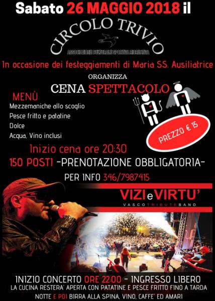 il CircoloTrivio organizza al Trivio di Ripatransone una CenaSpettacolo con il grande concerto dei ViziEVirtùVasco rossi Tribute Band.