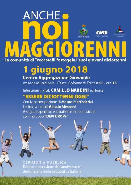 Venerdì 1 giugno 2018, alle ore 18, si terrà al Centro di Aggregazione Giovanile di Castel Colonna (ex sede municipale) la manifestazione ANCHE NOI MAGGIORENNI, la comunità di Trecastelli festeggia i suoi giovani diciottenni. Saranno presenti il Sindaco di Trecastelli Fausto Conigli e il Prof. Camillo Nardini, che parlerà ai giovani affrontando argomenti sul tema “Essere diciottenni oggi”. La cerimonia vedrà inoltre la partecipazione dell’attore di teatro Mauro Pierfederici e del giovane attore Alessio Messersì, che farà alcune letture. Interverrà anche il Dott. Michele Santini, collaboratore del Centro di Aggregazione Giovanile. Tra le autorità parteciperanno il Comandante della Stazione dei Carabinieri e il Comandante della Polizia Municipale di Trecastelli. Porteranno inoltre il loro saluto le associazioni di volontariato, cui ci si può iscrivere una volta raggiunta la maggiore età, come l’AVIS e la Protezione Civile. L’evento vuole mettere in risalto, con un momento simbolico, il raggiungimento della maggiore età dei ragazzi del territorio, con il pieno conseguimento dei diritti di cittadinanza. Un valore che sarà sottolineato con la consegna da parte del Sindaco della Città di Trecastelli ai ragazzi di una copia della Costituzione Italiana e della tessera elettorale. La cerimonia, organizzata in occasione dell’anniversario della nascita della Repubblica italiana, è pubblica, e tutta la cittadinanza è invitata a partecipare. Subito dopo ci sarà, sempre al Centro di Aggregazione Giovanile, musica live con il gruppo DEW DROPS e un aperitivo gratuito, in occasione del termine dei laboratori di “A.A.A. Cercasi Aggregazione Apprendimento Autonomia”, progetto che si è avvalso del cofinanziamento della Regione Marche e del Dipartimento della Gioventù e del Servizio Civile Nazionale.