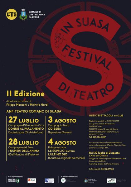 Il Centro Teatrale Senigalliese e l'Amministrazione comunale di Castelleone di Suasa, in collaborazione con il Consorzio Città Romana di Suasa e l'Associazione Turistica Pro Suasa organizzano la Rassegna Teatrale Estiva "InSuasa2018" nella splendida cornice dell'Anfiteatro Romano di Suasa.