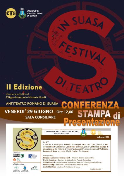 Vi attendiamo alla Conferenza Stampa di Presentazione del Festival di Teatro "InSuasa2018", che si terrà presso la Sala Consiliare del Comune di Castelleone di Suasa Venerdì 29 Giugno 2018, ore 12,00 e nella quale saranno presenti: