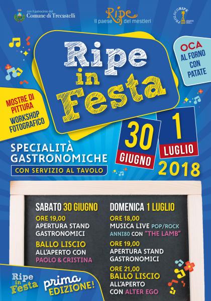 Sabato 30 giugno e domenica 1 luglio 2018 si terrà la prima edizione di RIPE IN FESTA, con ballo all'aperto e stand gastonomici. la manifestazione è a cura di Pro Loco Ripe.