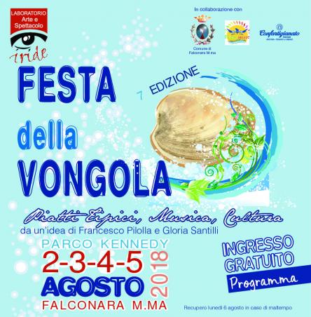 La Festa è nata nel 2011 da un’idea di Francesco Pilolla e Gloria Santilli dell’Associazione Culturale IRIDE, che ne cura l’organizzazione in collaborazione del Comune di Falconara M.ma , la Confartigianato e la Proloco Falconamare. La festa si svolge nel bellissimo parco Kennedy, cuore verde della città,in prossimità del mare. La location ospita, in occasione della festa,un mercatino Hand Made, uno spazio giochi con gonfiabili, tiro a segno ecc., uno spazio benessere con sedute di riflessologia plantare. Presente nel parco una grande pista per i concerti e il ballo e lo spazio ristorazione con tavoli immersi nel verde del boschetto. La vongola è la regina di un menù che offre diversi piatti tipici della nostra cultura marinara: ad esempio chitarrine alle vongole, mezze maniche allo scoglio, guazzetto di vongole, soutè di cozze, seppie coi piselli, frittura di pesce ecc. .