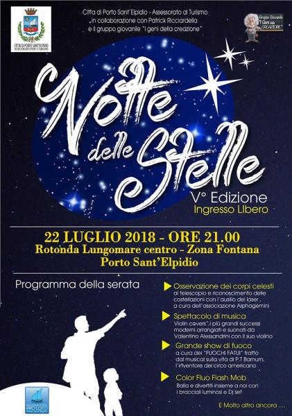 V° edizione della Notte delle Stelle a Porto Sant'Elpidio con un ricco programma: osservazione dei corpi celesti, spettacolo di musica, grande show di fuoco, Color Fluo Flash Mob e molto altro ancora.