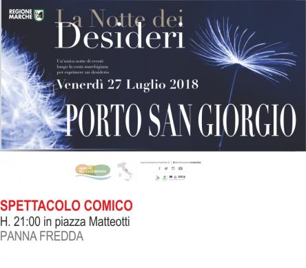 Porto San Giorgio, connubio tra mare e storia, ospita La Notte Dei Desideri dalle ore 21:00 in Piazza Matteotti con spettacoli comici che allieteranno la vostra serata.