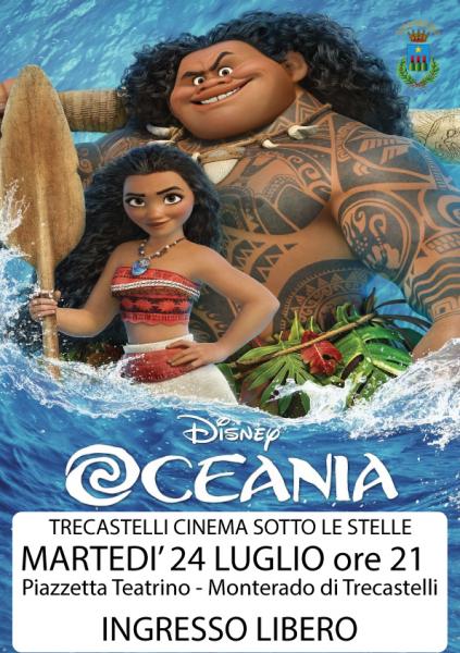 Ultimo appuntamento con Trecastelli Cinema sotto le Stelle martedì 24 luglio, alle ore 21.00, nella Piazzetta del Teatrino a Monterado con la proiezione del cartone animato OCEANIA.Il colorato film d’animazione è il cinquantaseiesimo classico Disney ed è stato realizzato dagli stessi ideatori di due cartoni animati di successo: Frozen e Zootropolis. La pellicola consentirà a grandi e piccini di immergersi completamente nella calda atmosfera dell’Isola del Pacifico, in compagnia di tanti fantastici personaggi, alla scoperta delle numerose isole dell’Oceania. Il cartone animato racconta la storia di Vaiana, una curiosa adolescente che vuole salvare il suo popolo. Nell’avventurosa impresa sarà sostenuta da Maui, un semidio caduto in disgrazia, che la aiuterà a realizzare il sogno di diventare una grande esploratrice. I due ragazzi attraverseranno l’oceano in un viaggio entusiasmante, pieno di difficoltà e pericoli ma anche di tante emozioni, che poteranno Vaiana a compiere i viaggi e le scoperte iniziati dai suoi antenati e scoprire la propria identità. La ricerca di se stessi e le esplorazioni geografiche sono le tematiche di questo cartone animato, che saprà coinvolgere il pubblico di adulti e bambini nella tappa conclusiva della rassegna estiva di cinema all’aperto. La manifestazione, giunta quest’anno alla quarta edizione, è promossa dal Comune di Trecastelli in collaborazione con l’Associazione Artistico Culturale Nuvolepiatte Onlus. La partecipazione al cartone animato OCEANIA è a ingresso libero.