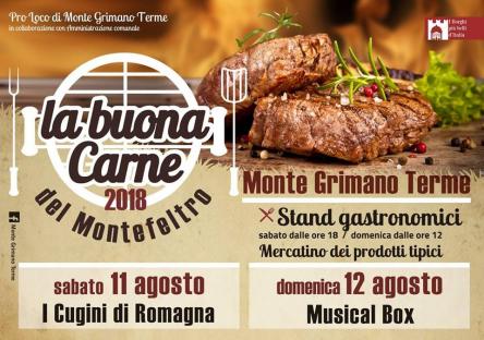 Ogni anno nel mese di agosto si svolge a Monte Grimano Terme la tradizionale sagra "La buona carne del Montefeltro". Buon cibo, musica dal vivo, ballo, mercatino di prodotti tipici alimentari e d'artigianato locale, vi attendono sabato 11 e domenica 12 in uno dei borghi più belli d'Italia, paese del #bookcrossing.