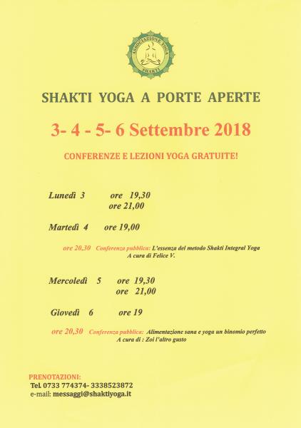 I CORSI Yoga dal 3 al 6 Settembre saranno i seguenti - Lunedì 3 ore 19,30 ore 21,00 - Martedì 4 ore 19,00 ore 20,30 Conferenza pubblica: I'essenza del nostro metodo Yoga - Mercoledì 5 ore 19,30 ore 21,00 - Giovedì 6 ore 19 ore 20,30 Conferenza pubblica: Alimentazione sana e yoga binomio perfetto Le lezioni saranno tenute da tutti gli insegnanti del Centro E' NECESSARIO PRENOTARE LA LEZIONE CHE SI INTENDE FREQUENTARE!! Consultazioni di Osteopatia .. Gratuita!!! Vernillo Nimai Francesco Con breve trattamento per allineamento posturale e funzionalità motoria nei seguenti giorni :4 - 5 - 6 PER PRENOTARE IL CONSULTO TEL. 3385374500 INFORMAZIONI Tel. 0733 784527 - 3338523872 ASS.NE YOGA SHAKTI A.S.D