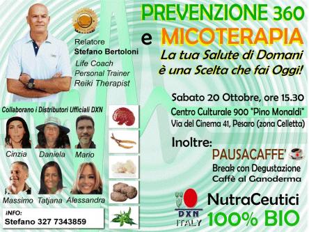 Per la nostra salute esiste una risposta, tutta naturale e senza controindicazioni, e per conoscerla basta partecipare al prossimo incontro/evento "PREVENZIONE 360 E MICOTERAPIA", Sabato 20 Ottobre 2018, ore 15,30, presso Circolo Culturale 900 "Pino Monadli", via del Cinema 41, zona Celletta, a Pesaro.