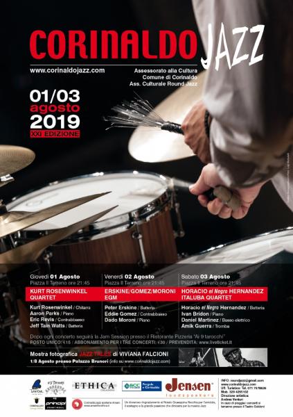 Il programma : GIOVEDI 1 AGOSTO Piazza Il Terreno ore 21:45 KURT ROSENWINKEL 4tet Kurt Rosenwinkel - chitarra Aaron Parks - piano Eric Revis - C.basso Jeff “tain” Watts – batteria VENERDI 2 AGOSTO Piazza Il Terreno ore 21:45 EGM (Erskine, Gomez, Moroni) Peter Erskine - batteria Dado Moroni - piano Eddie Gomez – C.basso SABATO 3 AGOSTO Piazza Il Terreno ore 21:45 HORACIO 'el negro' HERNANDEZ "ITALUBA 4tet" Horacio “el Negro” Hernandez - batteria Ivan Bridon - piano Daniel Martinez – basso el. Amik Guerra – tromba MOSTRA FOTOGRAFICA della fotografa Viviana Falcioni titolata “JAZZ TALES’” e allestita all’interno degli spazi del prestigioso Palazzo Brunori in Via del Corso 45. Da giovedì 1 agosto 2019 alle ore 18:00 e sarà visitabile fino al 18 agosto tutti i giorni dalle 17:00 alle 19:00; la domenica anche dalle 10:00 alle 12:00. Dopo il concerto , Jam Session presso il “I 9 Tarocchi”: ingresso libero INFO & BIGLIETTI: Posto unico € 15,00 Abbonamento per tre concerti € 30 ONLINE TICKETS : www.liveticket.it/corinaldojazz E’ possibile assicurarsi un posto numerato acquistando preventivamente il singolo biglietto/abbonamento nel sito. In prevendita saranno venduti SOLAMENTE 150 POSTI. I restanti biglietti potranno essere acquistati la sera del concerto, a partire dalle ore 20:00 direttamente nella biglietteria della Piazza il terreno. In caso di cattivo tempo i concerti si terranno presso il Teatro Goldoni di Corinaldo. Informazioni: tel. 071-7978636 (Uff. turistico iat) - 329 4295102 Associazione Culturale ‘ROUND JAZZ : roundjazz@gmail.com