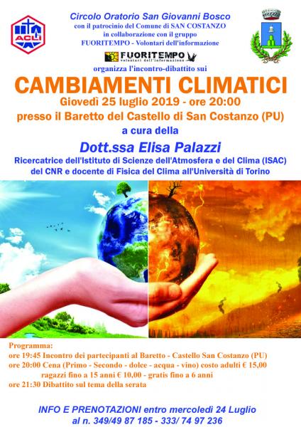 Giovedì 25 luglio a San Costanzo alle ore 20, presso il Baretto del Castello di San Costanzo, il Circolo ACLI di San Costanzo, l’amministrazione comunale di San Costanzo e il Gruppo Fuoritempo, propongono un approfondimento con la dott.ssa Elisa Palazzi, ricercatrice del CNR-ISAC (Istituto di Scienze dell'atmosfera e del clima) e docente di Fisica del Clima all'Università di Torino.