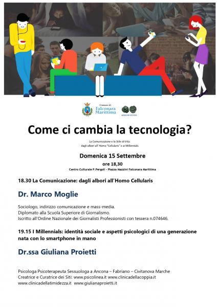 Negli ultimi dieci anni gli smartphone hanno modificato la nostra vita, ma allo stesso tempo sono aumentati anche i rischi per la privacy. Fermiamoci un momento e proviamo ad immaginare come era la nostra vita prima che Steve Jobs inventasse il primo smartphone. Sono infatti passati quasi dieci anni da quando il fondatore di Apple presentò al mondo l’iPhone. Difficile oggi pensare che siamo riusciti a vivere anche senza essere continuamente connessi.La tecnologia si sta sostituendo all'uomo in quasi tutto, forse anche nel modo in cui pensiamo; se ad esempio abbiamo un dubbio, basta andare su internet per trovare le risposte. Certo, da una parte la facilità con cui è possibile accedere ad un numero elevato di informazioni aumenta la nostra conoscenza, dall'altra però diminuisce la nostra capacità di ragionamento e di memoria. I nostri esperti relatori, il sociologo Dr marco Moglie e la psicologa Dr.ssa Giuliana Proietti saranno chiamati a illustrarci dei pro e dei contro, con dibattito finale.