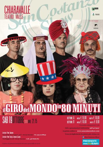 sabato 19 ottobre Teatro Valle Chiaravalle (AN) Il Giro del Mondo in 80 minuti spettacolo comico del San Costanzo Show Con le repliche autunnali si conclude la tournée regionale de Il Giro del Mondo in 80 Minuti, spettacolo comico del San Costanzo Show dedicato al tema del viaggio. La compagnia comica più amata delle Marche sarà in scena sabato 19 ottobre ore 21,15 al Teatro Valle di Chiaravalle, ultima tappa di questo spettacolo nella provincia anconetana. Vedremo personaggi noti e nuovi in giro per le grandi capitali del mondo, incontreremo gli ultimi superstiti delle tribù incontattate, scopriremo il fascino delle culture del lontano Oriente, sempre più vicino. Usi e costumi, idiomi, danze, cibi e personaggi dai cinque continenti, per un viaggio in ottanta minuti alla scoperta del lato comico del mondo. In scena Romina Antonelli, Davide Bertulli, Geoffrey Di Bartolomeo, Oscar Genovese, Giovanni Giangiacomi, Massimo Pagnoni, Daniele Santinelli. Regia Oscar Genovese. Prossime ed ultime repliche de Il Giro del Mondo in 80 minuti: sabato 9 novembre Teatro Nicola Degli Angeli, Montelupone (MC), sabato 16 novembre Spazio Tondelli Riccione.